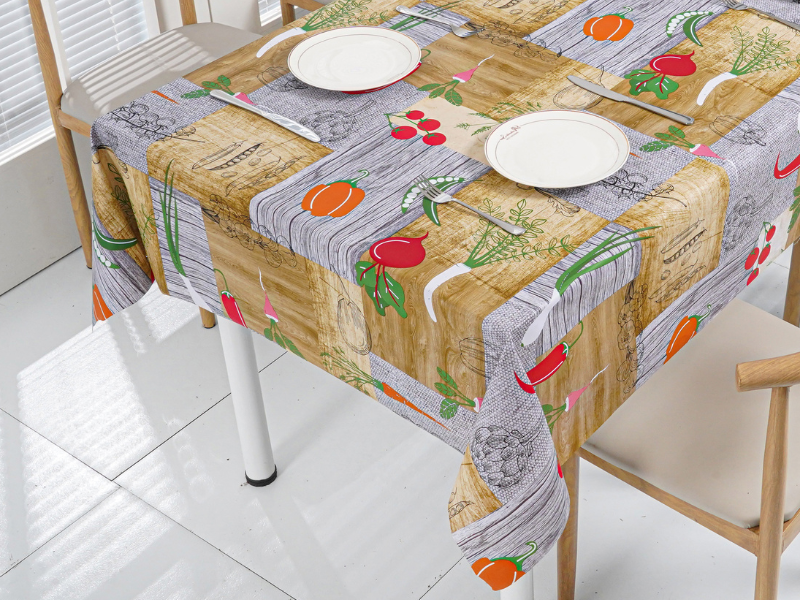 Foliový ubrus na podkladu z plátna v rolích 140 cm šir. a 20 m dlouhých. Složení: potištěná fólie 100% PVC na podkladu ze 100% plátna PP. Oeko-Tex Standard 100.