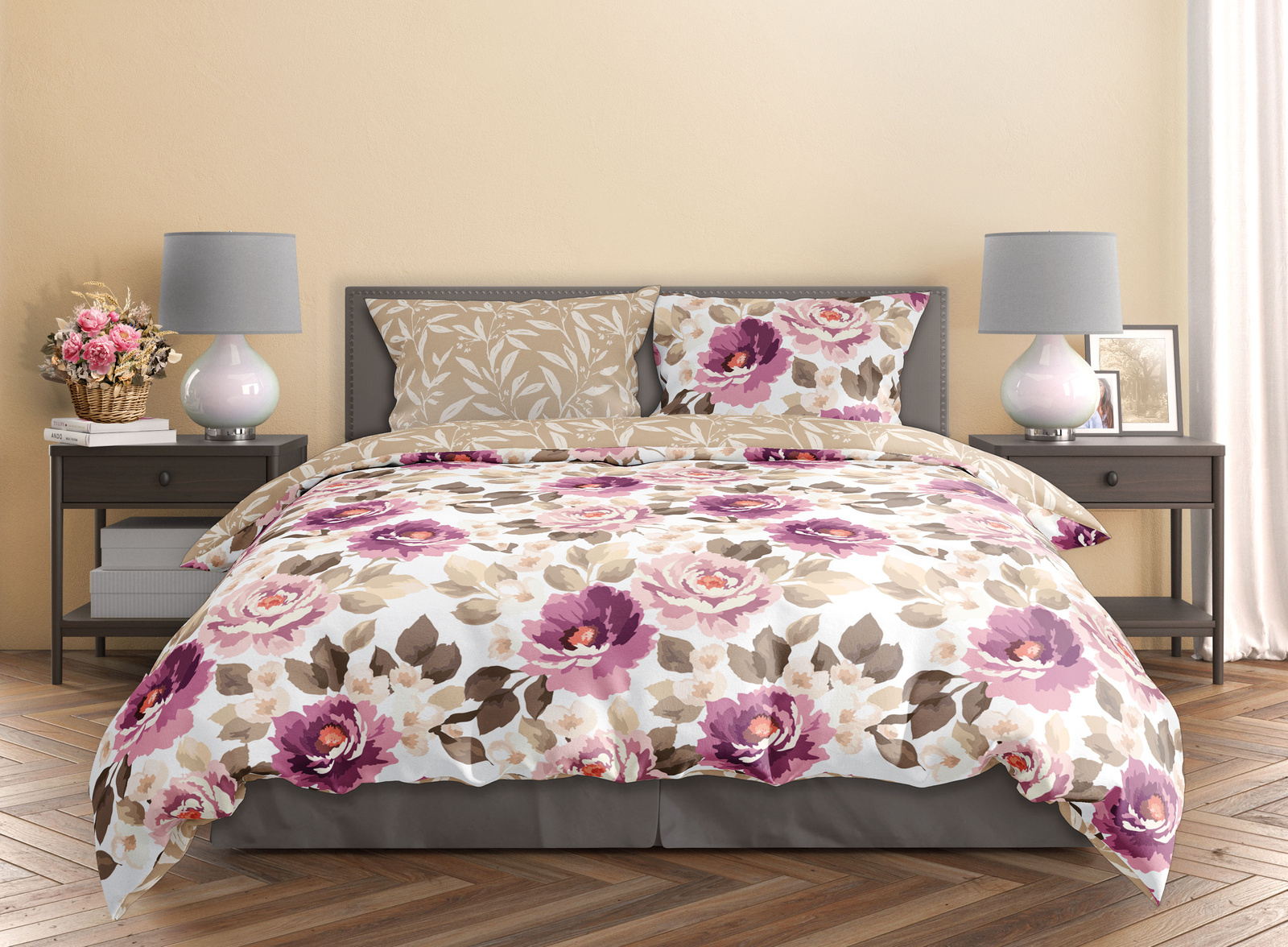 Vyrobeno z bavlněného saténu. Součástí sady je povlak na přikrývku a jeden povlak na polštář.